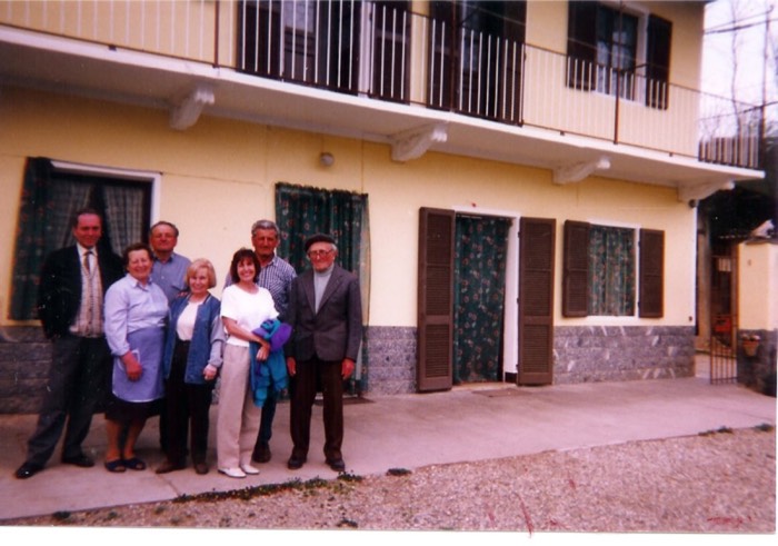 Photograph by Joann (Trabucco) Graham in 1995. Here is a picture taken in Italy. It shows Angelo Scavarda on left, Pietro Scarvarda standing on my right. It was taken outside of Grandpa Trabucco’s family home on the Trabucco Farm. {Aldo Trabucco is behind Joann.] I know it doesn’t look like a farm house. I think they built on to it after Grandpa Trabucco left Italy. It is a large house with beautiful pictures painted on the ceilings in living room and dining room.