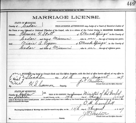 Marriage license between Thomas H. Scott and Nancy Ann “Nicie” Ryan, August 14, 1909, El Dorado, Cedar, Missouri.