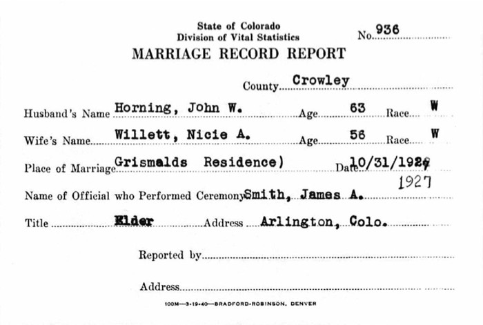 John William Horning/Nicie Ann (Ryan) Willett 10/31/1927 marriage record, Harry Griswold House, Crowley, Colorado