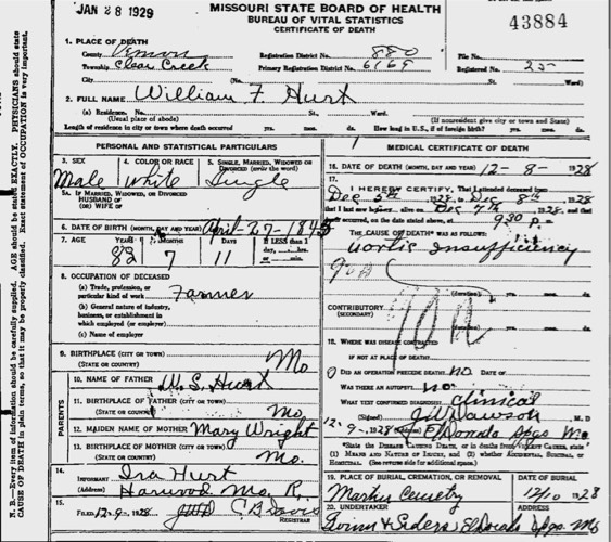 Son William Franklin "Bill" Hurt death certificate on Ancestry from INTEROCITER.