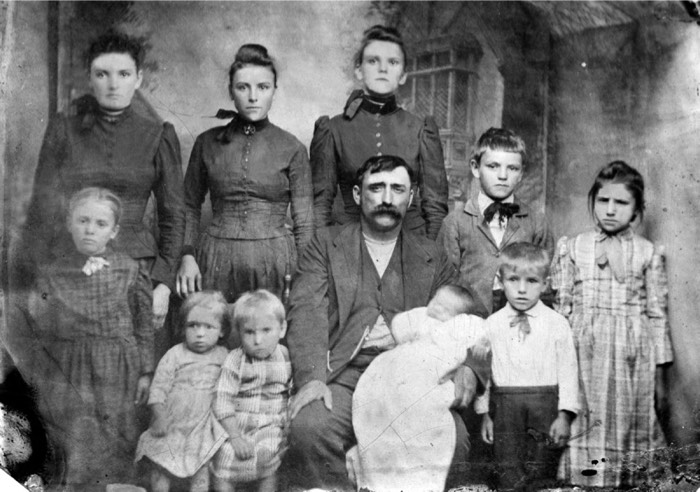 James McKeehan Johnson family. Back (l-r): Susan Lewallen, Rhoda Vanderpool, Georgia Tye, John Crit Johnson, Julia Ann Brown. Front row: Josie Bain, Sarah Tye, James B. Johnson, James M. Johnson, Ben Johnson and William M. Johnson. On Ancestry from David Johnson