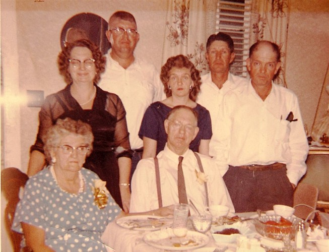 Left to right - William Admiral "Buddy" Johnson , Roea (Ryan) Johnson, William Henry Johnson, Madeline J. (Barnett), Doyle Johnson, Shirley J (Shrank), Eugene Johnson in William Henry Johnson's home 142 Idaho Ave Pueblo, CO