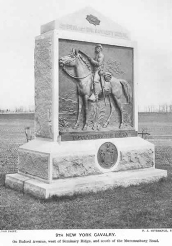 Reverse - 9TH NEW YORK CAVALRY ENLISTED, OCTOBER 1, 1861. RE-ENLISTED, JAN. 2, 1864. MUSTERED OUT, JULY 17, 1865. TOTAL ENLISTMENT AMONG WHICH LOSSES OCCURRED, 1,981. LOSSES DURING SERVICE: KILLED IN ACTION, 63; DIED OF WOUNDS, 32; OTHERS WOUNDED, 270; DIED WHILE PRISONERS, 16; OTHERS CAPTURED 125. BATTLE LOSSES, 506; KILLED ACCIDENTALLY, 3; DIED OF DISEASE, 110. AGGREGATE LOSSES, 619. BATTLES AND SKIRMISHES, 141. BATTLE FLAGS CAPTURED, 5. PRINCIPAL ENGAGEMENTS. WILLIAMSBURG, POPE'S CAMPAIGN, BEVERLY FORD, ASHBY'S GAP, GETTYSBURG, WILLIAMSPORT, BRANDY STATION, WILDERNESS, YELLOW TAVERN, MEADOW BRIDGE, COLD HARBOR, TREVILIAN STATION, DEEP BOTTOM, SMITHFIELD, LEETOWN, WINCHESTER, PORT REPUBLIC, TOM'S BROOK, CEDAR CREEK, GORDONSVILLE, WAYNESBORO, DINWIDDIE C. H., FIVE FORKS, SAILOR'S CREEK, APPOMATTOX.