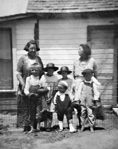 On back of photograph: “Mrs. Grale, Roea, Madge, Odell McCrale, Orvile, Engle, Admiral”. Roea Ann “Roy” Ryan right, the children; Madge (Helvetta Madeline “Madge” Johnson tall girl between women, William Admiral “Buddy” Johnson right front with boxing gloves on.