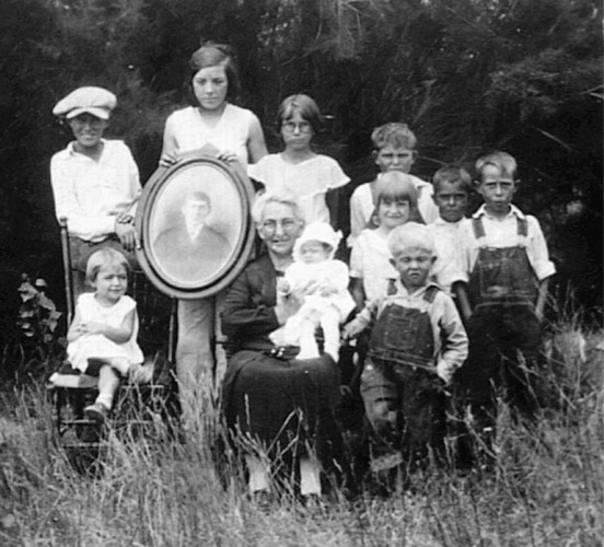 JHJ collection, labeled on back "Grandma Ryan, Admiral Johnson, Evlyne Root, Pathena Griswould, Eugene Johnson, Roy Griswould, Harold Griswould, Florence Hughes, Doyle Johnson, Olene Griswould, Nicie Ann Johnson, Grandpa picture", these names are out of order.