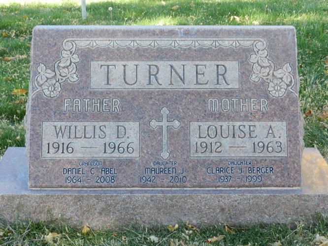 Willis Daniel Turner & Louise Alice Hughes stone on Ancestry from Ron West. Stone for Willis Daniel Turner, Louise Alice Hughes, Daniel C. Abel, Maureen J. Turner and Clarice J., Turner.