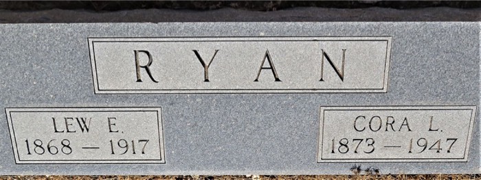 Lewellyn E. "Lew" Ryan & Cora Luginia Atkins stone on Find A Grave by M. Bishop.