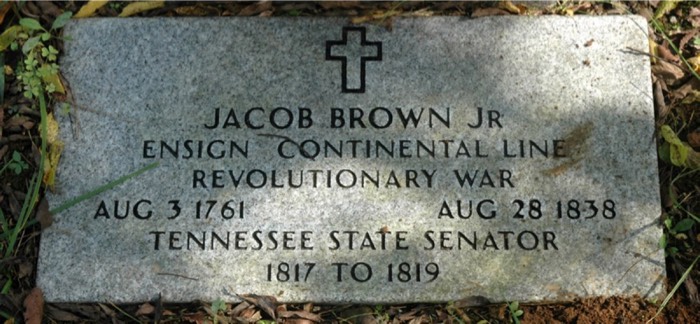 Jacob Brown Jr. stone photograph by Casey Schauer on Ancestry. Cemetery notes and/or description: Take State Hwy 81 S out of Jonesborough, turn West onto Taylor Bridge Road (just before you cross the Nolichucky River). Go .8 mile (on the right is mailbox 299 in front of a two story brick house that sits back from the road) turn left through a gate, then immediately turn right onto a lane. Go past the barn and turn right, then straight through another gate, once through the gate, go left up to the top of the hill approximately 1/4 mile. The cemetery is in a stand of trees surrounded by a chain link fence and barbed wire. On one side, at the bottom of the hill is Cherokee Creek and on the other is the Nolichucky River. It has been recorded that outside the fence are fifteen unmarked slave graves.
