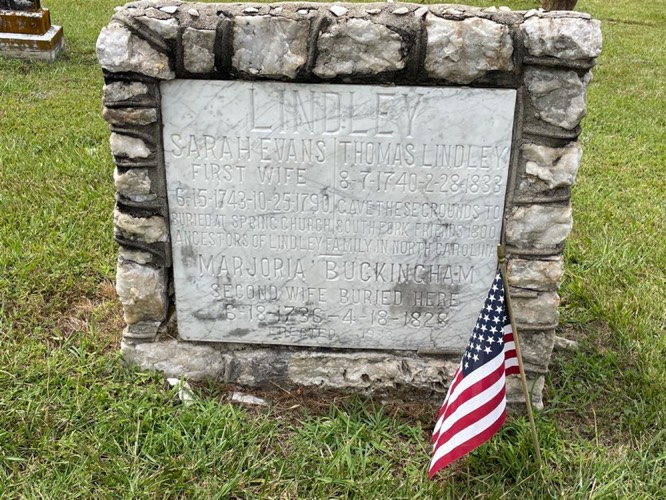 Thomas Lindley & wives Sarah Evans & Marjoria Piggott stone on Find A Grave from NC_Train_Man.
