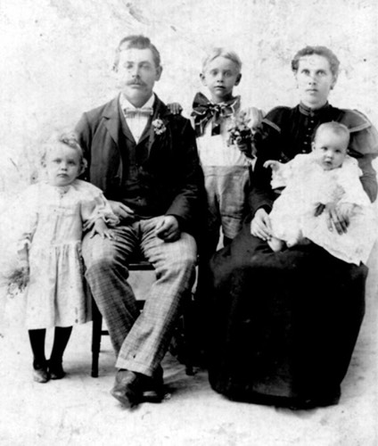 Lew Ryan family. I believe this is correct, the young family with their first children, left to right: Dollie Flossie, Lewellyn E. “Lew”, Clarence T., Cora Luginia Atkins, Sarah V.