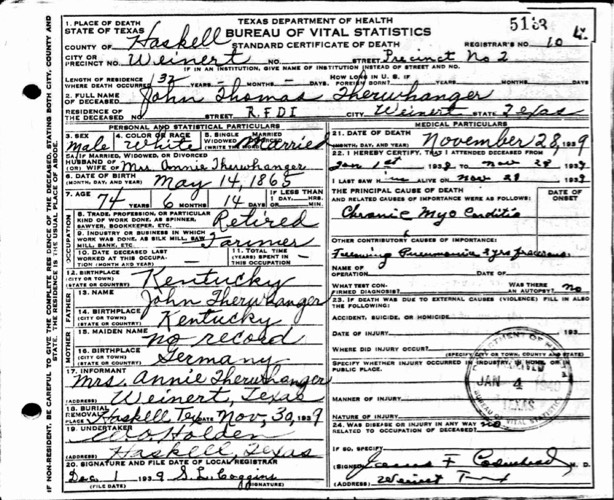 Husband John Thomas Therwhanger death certificate. Texas, U.S., Death Certificates, 1903-1982 for John Thomas Therwhanger Haskell 1939