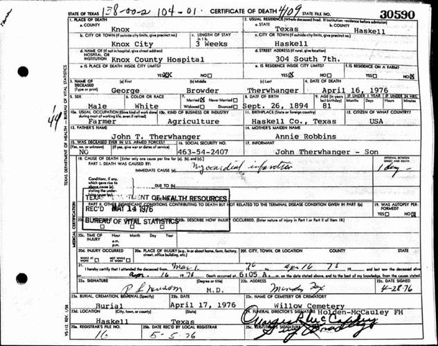 Son George Browder Therwhanger death certificate. Texas, U.S., Death Certificates, 1903-1982 for George T Therwhanger Knox 1976 Apr-Jun.