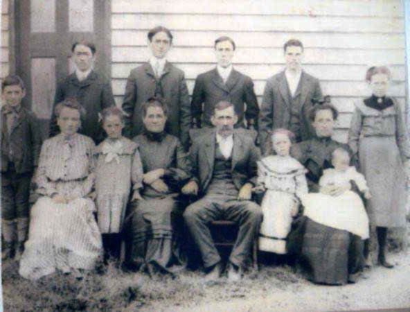 Front row left to right, Henry's wife Mary Elizabeth Alsip, Nannie Johnson, Almeda Hart Johnson (mother), Ambrose Brooks Johnson (father), Alley Jane Morgan, Sarah Johnson Morgan and infant Mary Morgan. Not in photo, son Ambrose II, died at age 29.